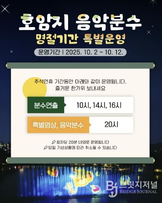 브릿지저널 김경미 기자 | 충주시는 도심 속 이색 명소로 자리매김한 호암지 음악분수의 가을철 운영 일정을 조정해 시민과 관광객들에게 한층 다채로운 볼거리를 제공한다고 밝혔다.