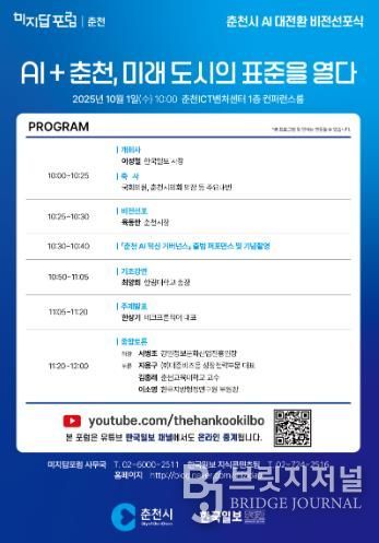 육동한 춘천시장은 “AI는 이미 도시의 미래를 바꾸는 핵심 동력”이라며 “이번 비전 선포식은 시민이 체감하는 AI 정책을 통해 춘천이 전국 최고의 AI 선도도시로 나아가는 출발점이 될 것”이라고 말했다. 이어 “춘천 AI 혁신 거버넌스와 시민이 함께 만들어갈 번영의 미래를 그려가겠다”고 강조했다.