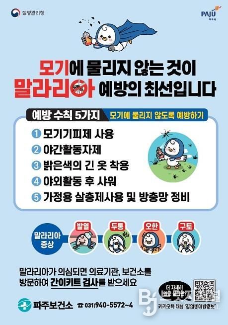 브릿지저널 김경미 기자 | 파주시는 추석 연휴 기간(10. 3.~10. 9.) 동안 말라리아 예방을 위해 오는 10월 4일과 10월 7일 이틀간 보건소 특별방역반 2개 조를 편성해 집중 방역소독을 실시한다고 밝혔다.