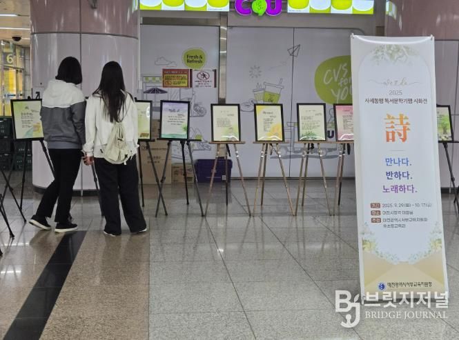 브릿지저널 정보영 기자 | 대전서부교육지원청은 9월 29일부터 10월 17일까지 대전시청역 대합실(대전 서구 둔산중로 55)에서 2025학년도 사제동행 독서문학기행 참가자 28명의 시화 작품 전시회 '詩-만나다. 반하다. 노래하다.'
