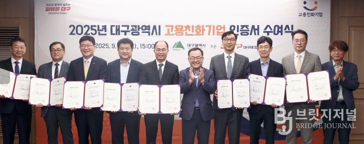 브릿지저널 김진석 기자 | 대구광역시는 9월 29일 오후 3시, 시청 산격청사에서 ‘2025년 고용친화기업 인증서 수여식’을 열고, 고용 창출 및 근무환경이 우수한 고용친화기업 신규 5개사와 재인증 6개사를 선정해 인증서를 수여했다.