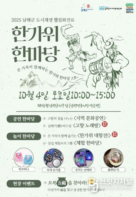 브릿지저널 김경미 기자 | 남해군도시재생지원센터는 추석연휴를 맞아 오는 10월 4일 NH농협 남해군지부 앞(전통시장 맞은편)에서 ‘한가위 한마당’ 행사를 개최한다고 밝혔다.