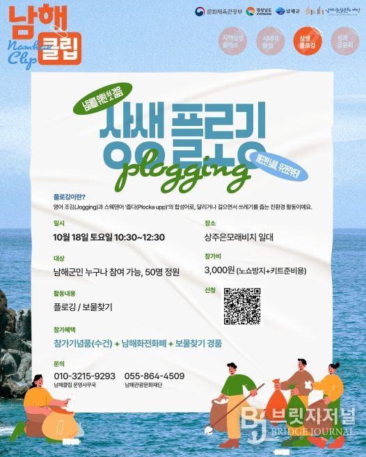 브릿지저널 김경미 기자 | 남해관광문화재단은 지역민과 함께 소통하고 교류하는 ‘함께 하는 상생 플로깅’을 오는 10월 18일오전 10시30분부터 상주은모래비치에서 개최한다고 밝혔다.