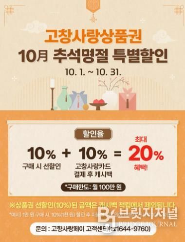 브릿지저널 윤나영 기자 | 고창군이 추석을 맞아 군민 생활안정과 지역경제 활성화를 위해 ‘고창사랑상품권 특별할인 행사’를 진행한다. 이번 행사는 10월 한 달간 진행된다.