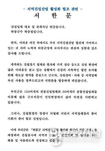 브릿지저널 김경미 기자 | 하승철 하동군수가 지난 26일 지역 건설산업 활성화를 위해 관내 업체 30개소에 서한문을 발송했다.