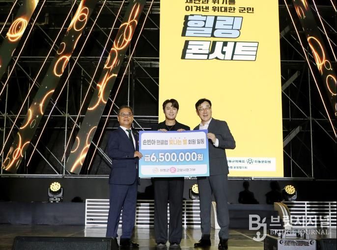 브릿지저널 김경미 기자 | 지난 29일, 하동공설운동장에서 개최된 힐링콘서트에서 손빈아 팬카페 회원들이 고향사랑기부금 650만 원을 전달했다.