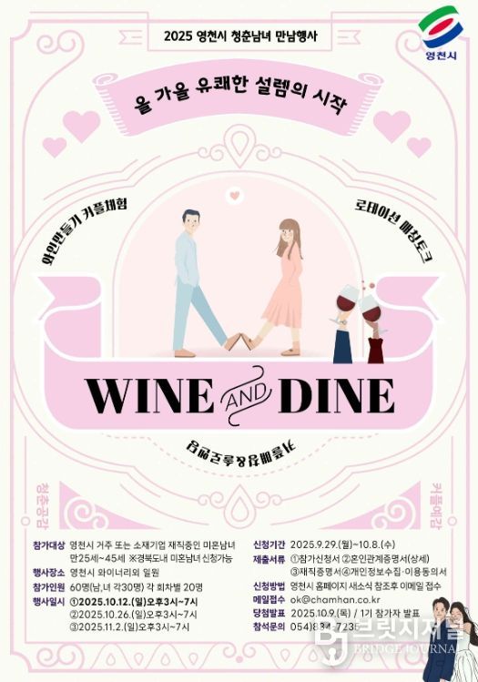 브릿지저널 정보영 기자 | 영천시는 오는 10월 12일, 10월 26일, 11월 2일 세 차례에 걸쳐 관내 와이너리에서 미혼남녀를 위한 특별한 만남 프로그램 ‘2025 영천愛 와인·다인(wine·dine)’을 개최한다.
