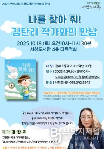 브릿지저널 김경미 기자 | 양산시립 서창도서관은 10월 18일 오전 10시 2025년 양산시 올해의 책 전국 독후감 공모전 선정도서인『나를 찾아줘!』의 저자 김탄리 작가를 초청해 작가와의 만남을 운영한다.