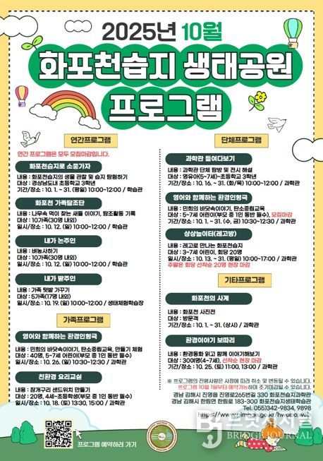 모든 프로그램은 누리집 ‘화포천습지’에서 예약할 수 있으며 문의는 화포천습지 과학관으로 하면 된다.