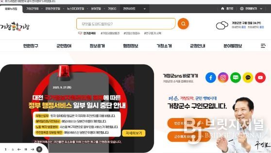 브릿지저널 김경미 기자 | 거창군은 지난 26일 발생한 대전 국가정보자원관리원(국정자원) 화재와 관련해, 군민 불편을 최소화하고 안정적인 행정서비스를 제공하기 위해 총력을 기울이고 있다고 30일 밝혔다.
