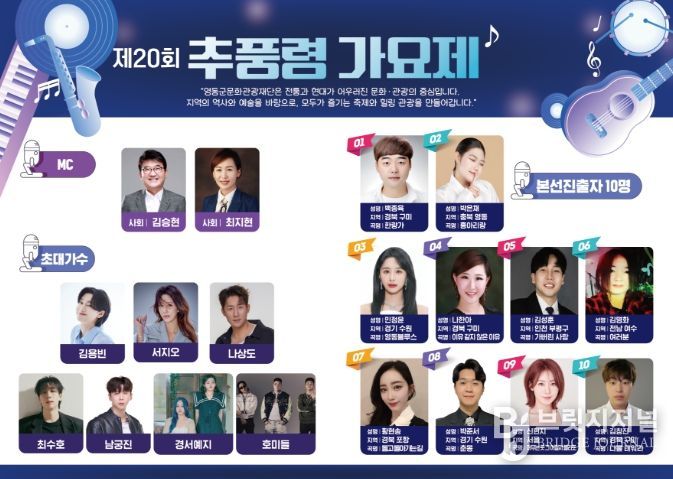 브릿지저널 김경미 기자 | 신인 가수들의 등용문으로 자리매김한 추풍령 가요제가 오는 4일 오후 7시, 레인보우힐링관광지 내 2025 영동세계국악엑스포 메인무대에서 열린다.