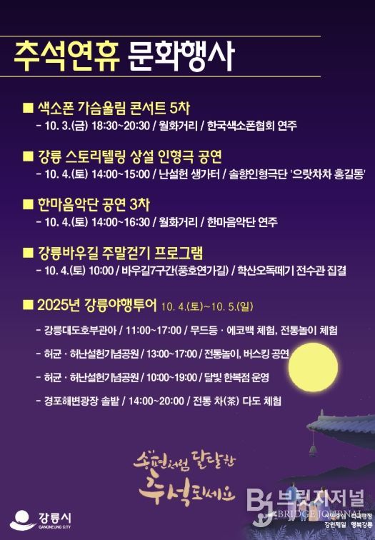 브릿지저널 윤나영 기자 | 강릉시는 역대 최장 추석 연휴를 맞아 시민과 귀성객, 관광객들이 즐길 수 있는 다양한 문화행사를 도심과 해변 곳곳에서 개최한다.