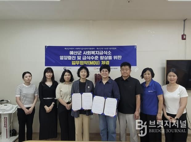 브릿지저널 정보영 기자 | 예산군 어린이·사회복지급식관리지원센터는 예산군 장기요양기관연합회와 관내 어르신의 건강 및 영양 증진을 위한 업무협약을 체결했다고 1일 밝혔다.