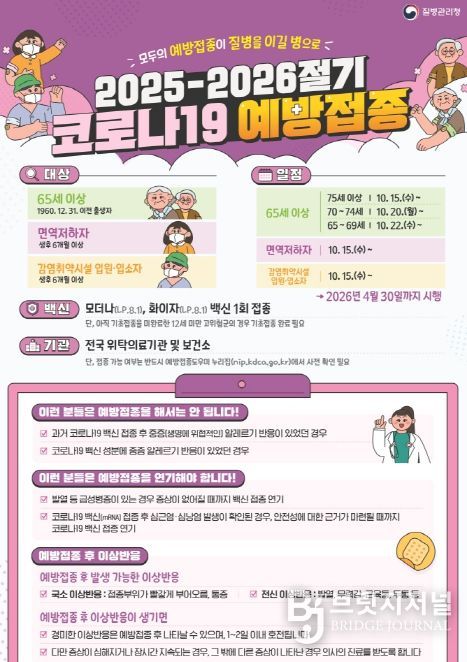 생후 6개월 이상 면역저하자 및 감염취약시설 입원·입소자와 75세 이상(1950.12.31.이전 출생자) 10월 15일부터, 70~74세(1951.1.1.~1955.12.31.)는 10월20일부터, 65~69세(1956.1.1.~1960.12.31.)는 10월 22일부터 접종 가능하며 2026년 4월 30일 종료된다.