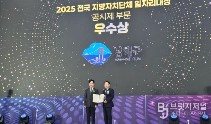 브릿지저널 김경미 기자 | 남해군이 9월 30일 청주 오스코에서 열린 고용노동부 주관 ‘2025년 전국 지방자치단체 일자리 대상’ 시상식에서 공시제 분야 우수상을 수상했다. 이번 수상은 2016년 우수상 이후 9년 만에 거둔 성과다.