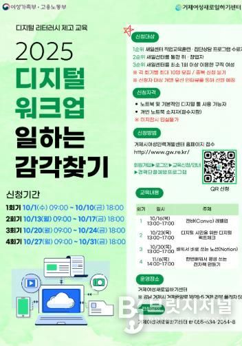 브릿지저널 김경미 기자 | 여성 취창업 지원에 앞장서고 있는 거제여성새로일하기센터는 AI 활용 시대를 맞아 여성들의 디지털기기 활용 능력과 현장 적용력을 높이기 위해 ‘디지털 리터러시(Digital Literacy) 교육’을 10월부터 본격 추진할 예정이다.