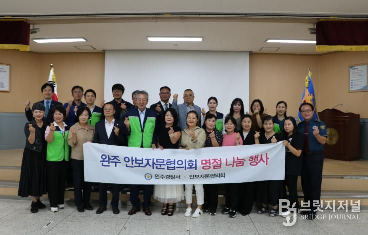 브릿지저널 윤나영 기자 | 완주경찰서는 추석명절을 맞이해 지난 29일, 추석명절을 맞이하여 군의회 김재천 부의장, 이순덕 의원 및 안보자문협의회, ㈜정석케미칼, 삼례·봉동 로타리클럽, 봉동로타리클럽등 30여명은 탈북민을 위한 따뜻한 사랑 나눔 행사를 가졌다.