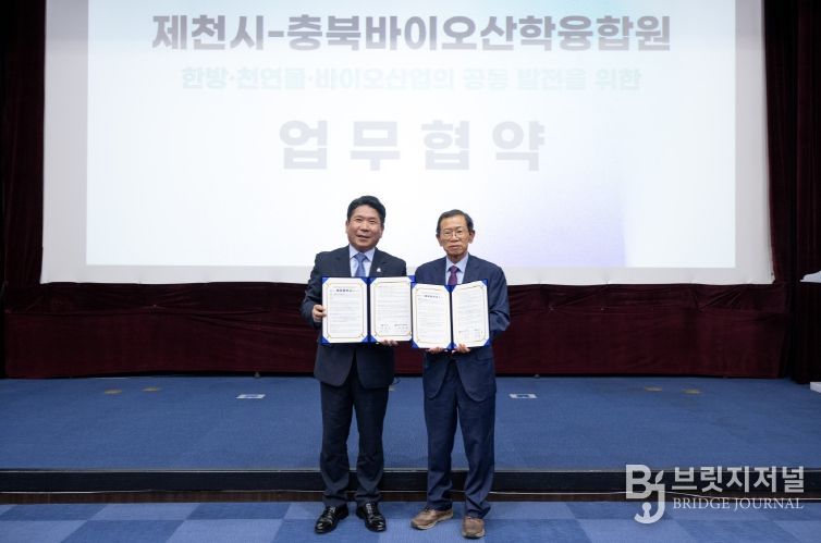 브릿지저널 김경미 기자 | 제천시는 9월 30일 ‘2025 제천국제한방천연물산업엑스포’ 기간 중 한방생명과학관 다목적강당에서 충북바이오산학융합원과 한방·천연물산업 발전을 위한 업무협약(MOU)을 체결했다.