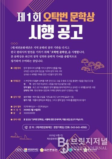 브릿지저널 김경미 기자 | (재)제천문화재단(이사장 김상수)은 지역 문학의 창작 기반을 다지고 한국 현대시의 발전을 기리기 위해 제천문화재단 제1회'오탁번 문학상'을 공고했다. 이번 문학상은 최근의 창작 성과와 문학적 기여를 종합적으로 평가하여 수여하는 상으로, 오탁번 시인의 문학 정신을 기리고 문학적 전통을 계승하는데 그 취지가 있다.