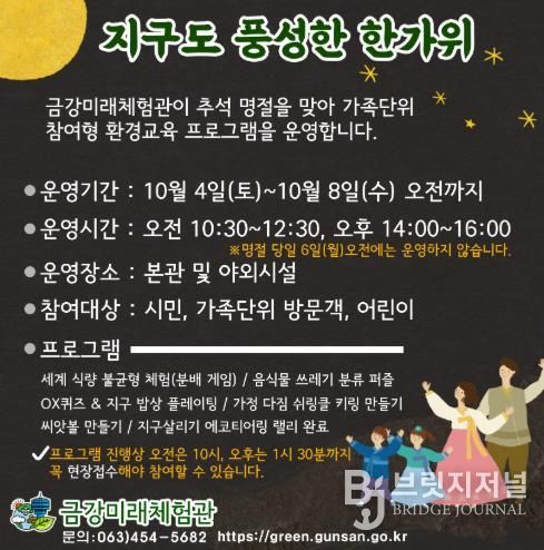 금강미래체험관은 오는 4일부터 8일까지 닷새간 본관과 야외시설 일대에서 ‘지구도 풍성한 한가위’를 주제로 한 특별 프로그램을 운영한다.