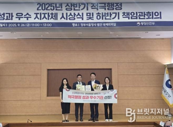 브릿지저널 윤나영 기자 | 강원특별자치도가 행정안전부 주관 ‘2025년 상반기 지방자치단체 적극행정 성과 점검’에서 전국 광역자치단체 중 유일하게 우수기관으로 선정돼 행정안전부 장관 표창을 수상했다.
