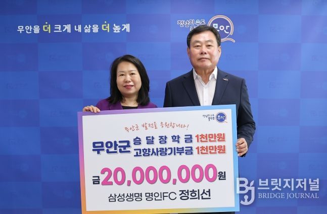 브릿지저널 김경미 기자 | 전남 무안군은 1일 삼성생명 정희선 명인FC가 지역 인재 양성과 지역 발전을 위해 소중히 써달라며 승달장학금 및 고향사랑기부금 각 1천만 원, 총 2천만 원을 기탁했다고 밝혔다.