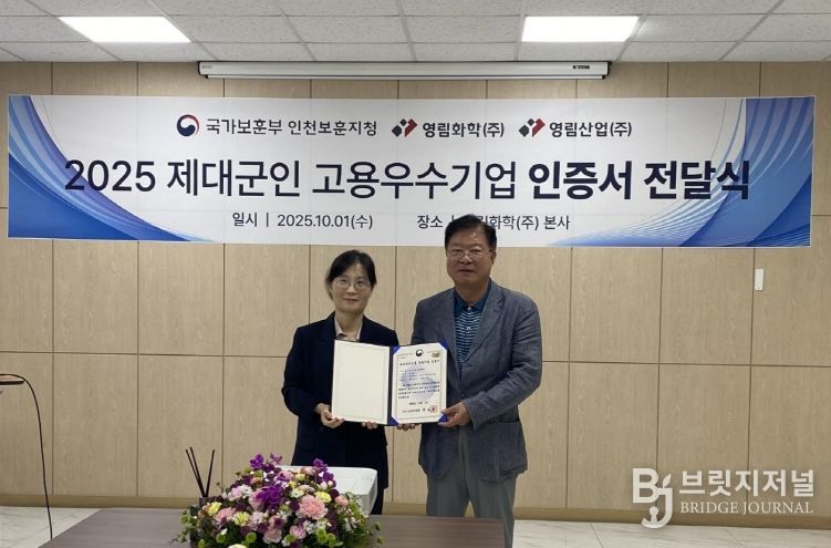 브릿지저널 김경미 기자 | 국가보훈부 인천보훈지청(지청장 직무대리 최은진) 제대군인지원센터는 2025년 10월 1일에 제대군인 주간을 맞아 영림그룹의 계열사인 영림화학(주)과 영림산업(주)을 방문하여 제대군인 고용 우수기업인증에 대한 현판식을 개최했다.