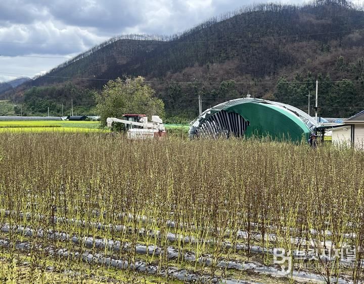 콩 콤바인 구조를 변형한 전용 콤바인으로 수확하면 베기와 탈곡(낱알 떨기)을 동시에 수행할 수 있어 작업시간이 기존 방식 대비 약 99% 절감된다.