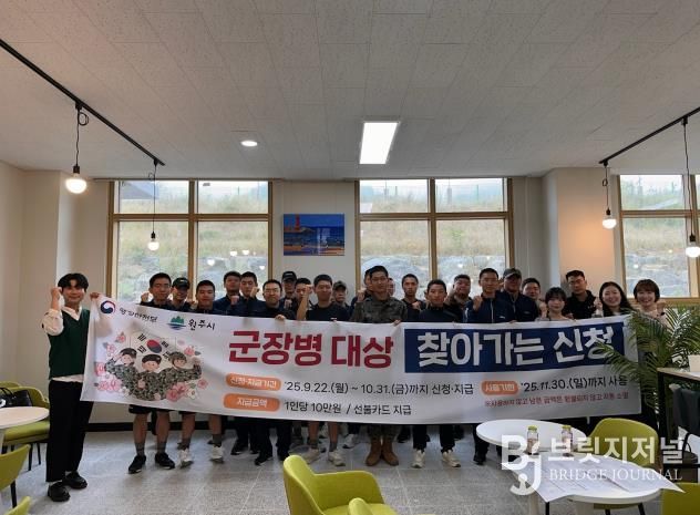 브릿지저널 윤나영 기자 | 원주시는 9월 30일부터 10월 1일 이틀간 군 장병 대상 “찾아가는 신청”을 접수받기 위해 항공사제71항공정비대대, 1군지사 2곳을 방문했다.
