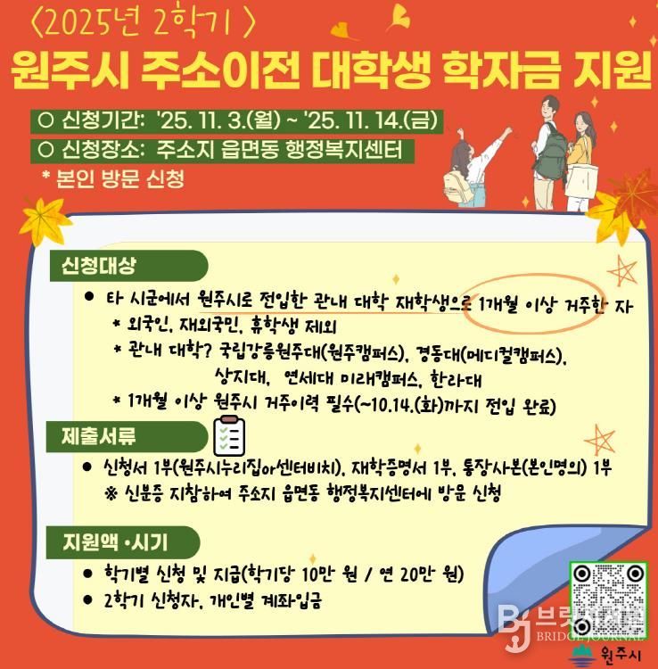 브릿지저널 윤나영 기자 | 원주시는 전입신고를 마치고 원주시민이 된 관내 대학생에게 상·하반기 각 10만 원씩 연 20만 원의 학자금을 지원하고 있다.