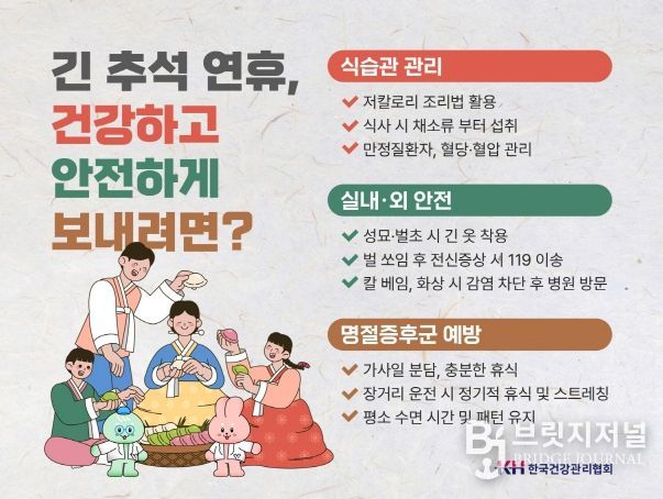 KH한국건강관리협회 인천지부 홍은희원장은 "긴 연휴에는 평소와 다른 식습관과 생활 리듬이 깨지기 쉬운 환경 때문에 오히려 건강 관리에 적신호가 켜질 수 있다”라며 “특히, 이번 연휴는 기간이 긴 만큼 만성질환자들은 평소의 식습관과 약 복용을 철저히 유지하는 것이 매우 중요하다”라고 당부했다.
