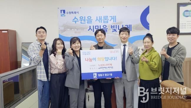 브릿지저널 김경미 기자 | 수원시 영통구 광교1동은 ㈜이언에듀케이션으로부터 이웃돕기 성금 300만원을 기탁받았다고 밝혔다.
