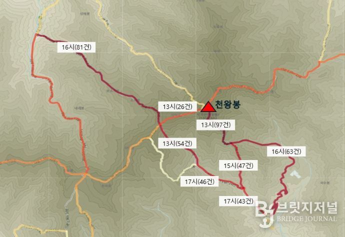 분석에 따르면 오후 1시~4시 사이 하산 구간에서 사고의 약 41%가 발생했으며, 주된 원인은 조난(32.2%), 사고·부상(29.6%), 질환(11.9%) 등으로 나타났다. 산행 시 체력 저하로 인한 부주의나 건강 상태를 고려하여 자기 몸에 맞는 등산 코스를 선택하는 것이 사고 예방에 도움이 된다.