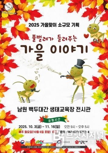 브릿지저널 윤나영 기자 | 남원시는 2025년 가을을 맞아 오는 10월 3일부터 11월 16일까지 백두대간 생태교육장과 지리산 허브밸리를 연계하여 각각 가을을 대표하는 풀벌레 등 다양한 곤충 전시하는 『풀벌레가 들려주는 가을이야기』, 그리고 다가오는 할로윈을 맞아 절지동물을 주제로 한 『미리 만나는 할로윈 : 오싹오싹 절지동물』 기획전을 진행한다.