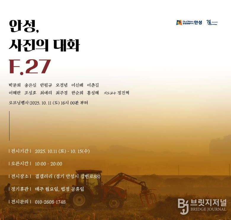 브릿지저널 김경미 기자 | 안성시 사진동아리 F.27 photo가 오는 10월 11일부터 15일까지 안성천 작은미술관 결갤러리에서 전시회 ‘안성, 사진의 대화 F.27’을 개최한다. 이번 전시는 동아리 회원 18명이 참여해 안성의 자연환경과 사람들의 이야기를 기록한 작품을 선보인다.