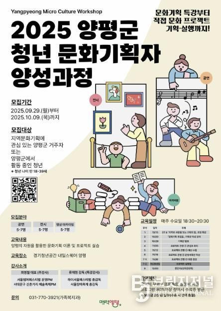 브릿지저널 김경미 기자 | 양평군은 청년들의 문화·예술 기획 역량 강화를 통해 지역사회 문화 활성화와 청년 일자리 창출을 지원하고자 ‘2025년 양평군 청년 문화기획자 양성과정’을 10월부터 12월까지 운영한다고 밝혔다.