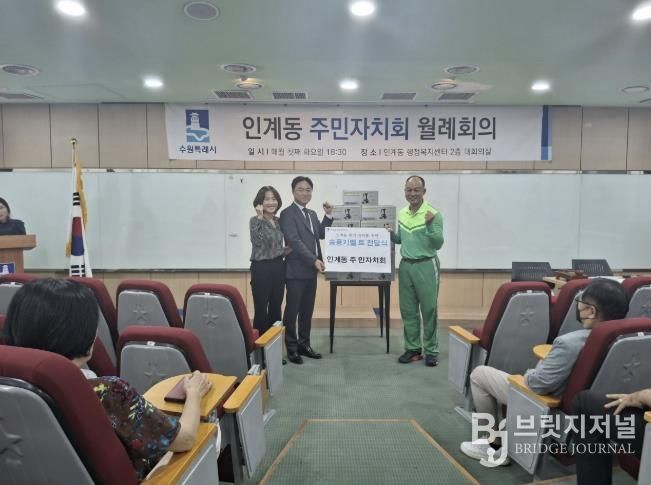 브릿지저널 김경미 기자 | 수원시 팔달구 인계동 주민자치회는 지난 10월 1일, 가을철 관내 낙엽청소용 송풍기 벨트(100만 원 상당)를 인계동 행정복지센터에 전달했다.