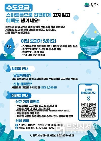 브릿지저널 윤나영 기자 | 원주시상하수도사업소는 ‘수도요금 알림톡 서비스’ 확대를 위해 10월 1일부터 12월 7일까지 신규 가입 이벤트를 진행한다.