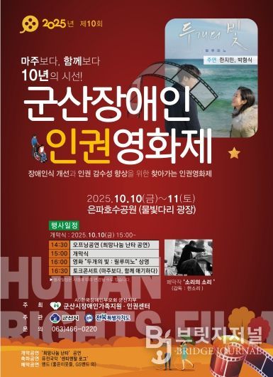 브릿지저널 윤나영 기자 | 군산시 장애인가족지원인권센터가 10월 10일부터 11일까지 은파호수공원 물빛다리 광장에서 군산시민을 대상으로 장애인 인식개선 및 인권의식 함양을 위한 2025년 제10회 군산장애인인권영화제를 개최한다.