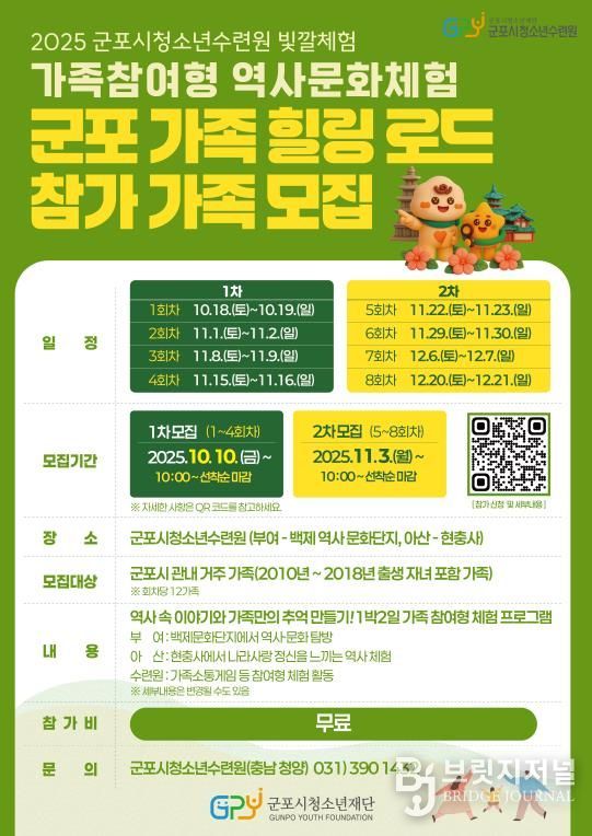 브릿지저널 김경미 기자 | 군포시청소년재단이 운영하는 군포시청소년수련원(충남 청양)은 관내 가족을 대상으로 2025년 가족참여형 역사문화탐방 '군포가족 힐링로드' 참가자를 모집한다.