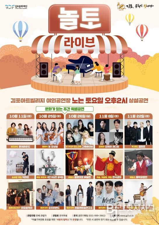 브릿지저널 김경미 기자 | (재)김포문화재단은 10월 11일부터 11월 22일까지 매월 둘째, 넷째 주 토요일마다 김포아트빌리지 야외공연장에서 하반기 토요상설공연 '놀토 라이브'를 개최한다고 밝혔다.