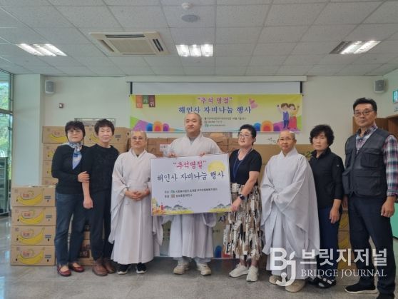 브릿지저널 김경미 기자 | 법보종찰 해인사와 조계종 사회복지재단 산하 코끼리행복복지센터는 10월 1일 봉산면, 묘산면, 가야면, 야로면의 노인맞춤돌봄서비스 대상자 어르신 800가구에 송편과 과일을 담은 선물 상자를 전달하는 ‘추석맞이 행복나눔 행사’를 진행했다.