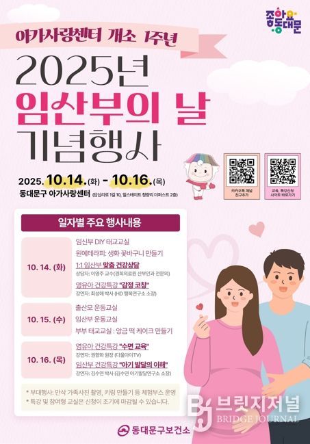 브릿지저널 김경미 기자 | 서울 동대문구는 오는 14일부터 16일까지 아가사랑센터 개소 1주년과 ‘2025년 임산부의 날’을 맞아 다양한 기념행사를 개최한다고 밝혔다.