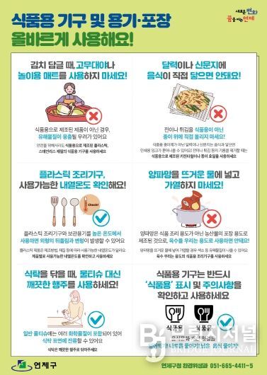 브릿지저널 윤나영 기자 | 연제구는 구민들의 건강을 지키고 안전한 식생활 문화를 확산하기 위해 ‘식품용 기구 및 용기・포장 올바르게 사용해요!’ 홍보물을 제작했다.