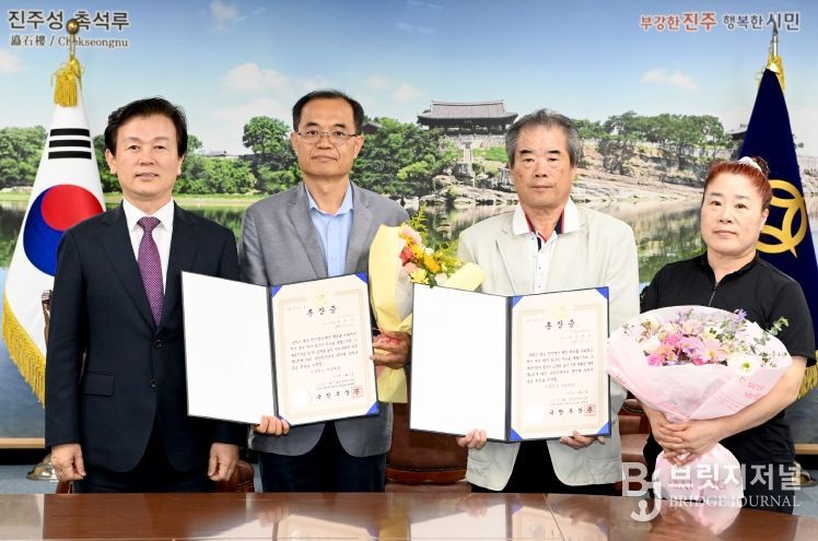 브릿지저널 김경미 기자 | 진주시는 2일 6·25전쟁 참전 유공자인 ‘故 김판식 일병’과 ‘故 윤도기 일병’의 유가족인 고인들의 조카 김형원, 윤성수 씨에게 각각 화랑무공훈장을 전수했다.
