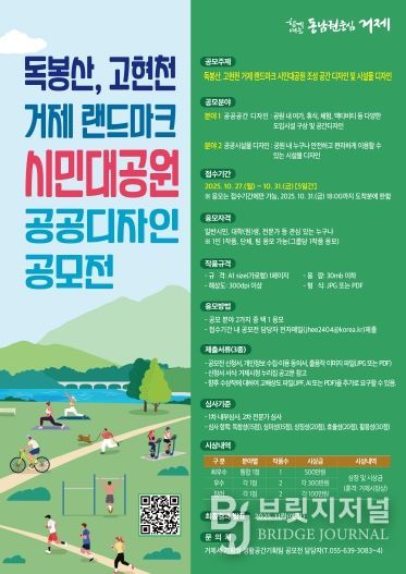브릿지저널 김경미 기자 | 거제시는 독봉산·고현천 일대 랜드마크 시민대공원 조성사업의 관심과 공감대를 형성하고, 다양한 아이디어를 반영하기 위하여 독봉산·고현천 거제 랜드마크 시민대공원 공공디자인 공모전을 개최한다.