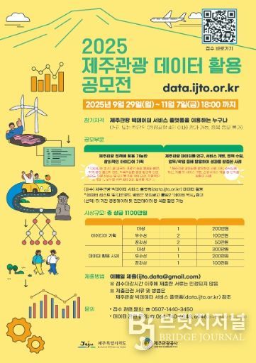 브릿지저널 정보영 기자 | 제주특별자치도와 제주관광공사는 오는 11월 7일까지 온라인 채널을 통해 ‘2025년 제주관광 데이터 활용 공모전’ 참가자를 모집하고 있다고 2일 밝혔다.