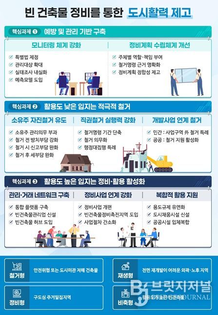 이에, 국토부는 ➊예방 및 관리 기반 구축, ➋활용도 낮은 빈 건축물의 적극적 철거, ➌활용도 높은 빈 건축물의 정비·활용 활성화 등 빈 건축물의 입체적 정비방안을 마련했다.