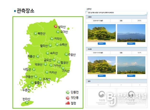 브릿지저널 김경미 기자 | 강원지방기상청(청장 장근일)은 올해 설악산(1,708m)의 첫 단풍이 10월 2일 시작됐다고 발표했다.