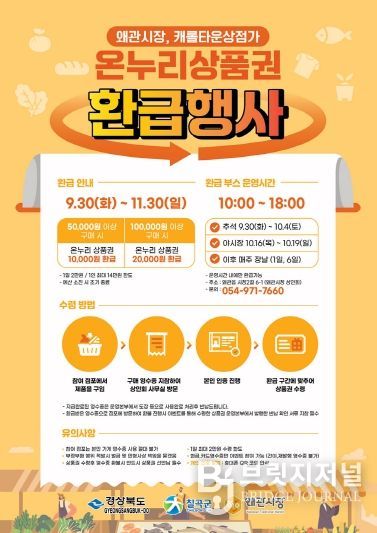 브릿지저널 정보영 기자 | 칠곡군은 전통시장 활성화와 지역경제 활력 제고를 위해 9월 30일(화)부터 11월 30일(일)까지 전통시장 구매 고객을 대상으로 온누리상품권 환급행사를 진행한다.